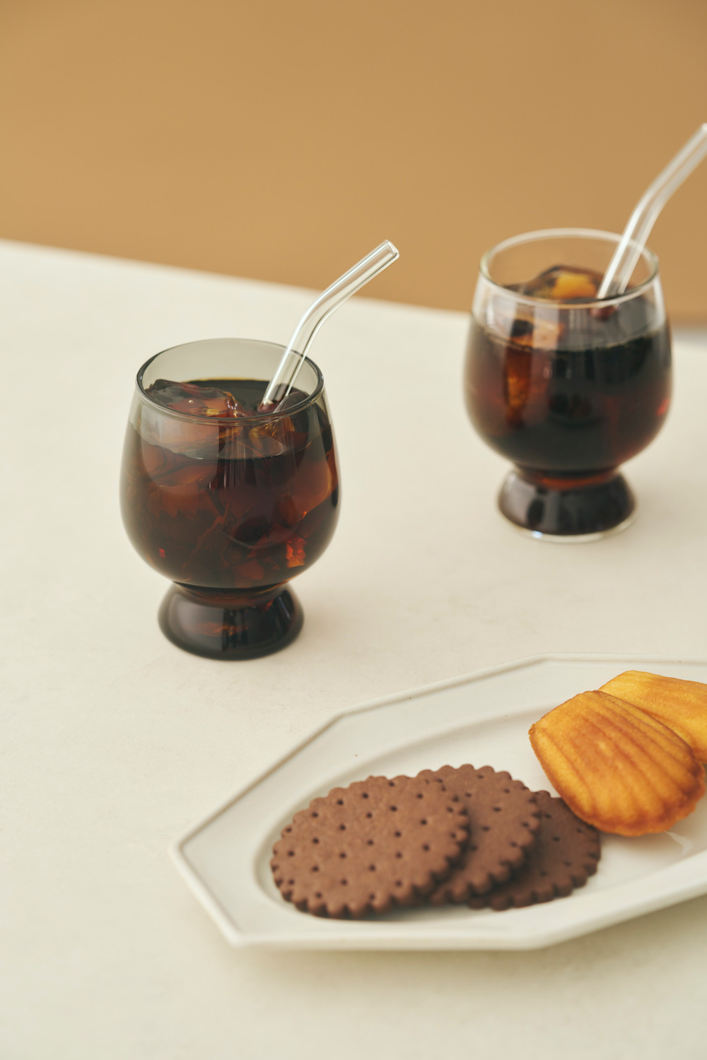 グラスの厚みは、口当たりが心地よい薄すぎず厚すぎないバランスを考慮しながら、気負いなく使える約2mmに仕上げました。耐熱ガラス製で、電子レンジ、食洗機も使用可能です。